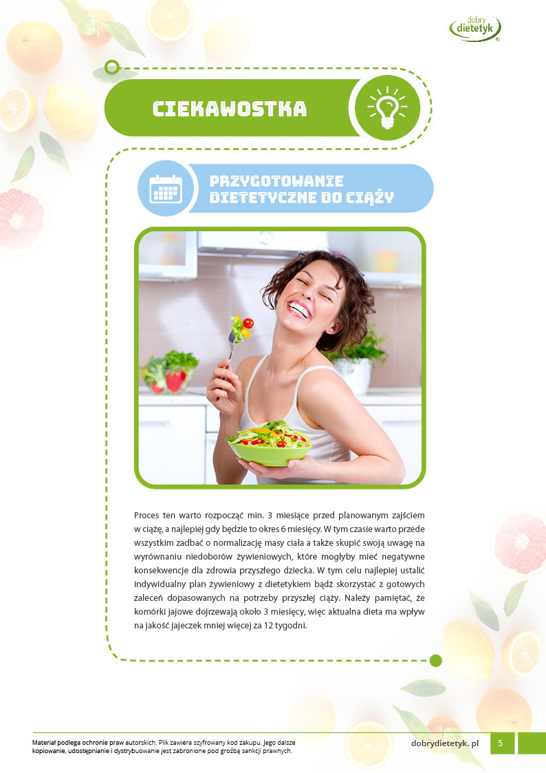 Ten wyjątkowy 30-dniowy program dietetyczny został specjalnie opracowany przez zespół dietetyków dla kobiet planujących ciążę. Jest to dieta przygotowana w celu poprawienia płodności oparta na żywności naturalnej, niskoprzetworzonej, bogatej w składniki pokarmowe potrzebne do osiągnięcia równowagi hormonalnej, funkcji reprodukcyjnych i późniejszego, prawidłowego rozwoju płodu. Jest to dieta bardzo pomocna w zrównoważeniu istniejących problemów z płodnością oraz zgromadzeniu zapasów składników odżywczych. W diecie położono szczególny nacisk m.in. na: odpowiednią podaż pełnowartościowego białka, wymaganych kwasów tłuszczowych, wysoką zawartość żelaza, folianów, witaminy B12, cynku i wielu innych składników odżywczych.